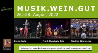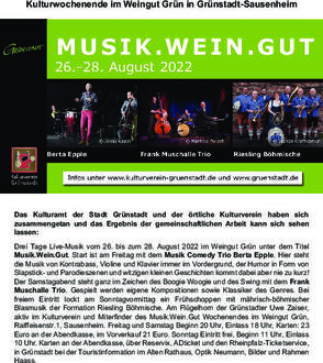 Drei Tage Live-Musik vom 26. bis zum 28. August 2022 im Weingut Grün unter dem Titel Musik.Wein.Gut. Start ist am Freitag mit dem Musik Comedy Trio Berta Epple. Hier steht die Musik von Kontrabass, Violine und Klavier immer im Vordergrund, der Humor in Form von Slapstick- und Parodieszenen und witzigen kleinen Geschichten kommt dabei aber nie zu kurz! Der Samstagabend steht ganz im Zeichen des Boogie Woogie und des Swing mit dem Frank Muschalle Trio. Gespielt werden eigene Kompositionen sowie Klassiker des Genres. Bei freiem Eintritt lockt am Sonntagvormittag ein Frühschoppen mit mährisch-böhmischer Blasmusik der Formation Riesling Böhmische. Am Flügelhorn der Grünstadter Uwe Zaiser, aktiv im Kulturverein und Miterfinder des Musik.Wein.Gut Wochenendes im Weingut Grün, Raiffeisenstr.1, Sausenheim. Freitag und Samstag Beginn 20 Uhr, Einlass 18 Uhr, Karten: 23 Euro an der Abendkasse, im Vorverkauf 21 Euro. Sonntag Eintritt frei, Beginn 11 Uhr, Einlass 10 Uhr. Karten an der Abendkasse, über Reservix, ADticket und den Rheinpfalz-Ticketservice, in Grünstadt bei der Touristinformation im Alten Rathaus, Optik Neumann, Bilder und Rahmen Haass.