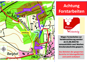 Alle Bereiche, in denen Forst- bzw. Baumfällarbeiten stattfinden, werden lokal durch Sperrungen gesichert. Eine temporäre Umleitung des Pfälzer Weinsteigs über die sog. „Mandelhohl“ ist vor Ort eingerichtet.