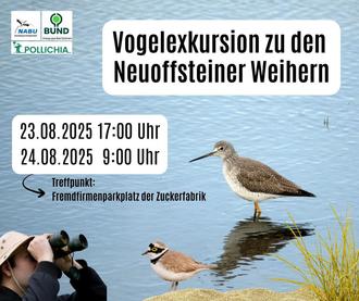 Am Samstag, den 23. August, 17:00 Uhr und am Sonntag, den 24. August, 9 Uhr veranstalten die NABU-Gruppe Eisenberg/Leiningerland, der BUND Kreisgruppe Bad Dürkheim, und die Pollichia zwei gemeinsame ornithologische Exkursionen zu den Klärteichen der Zuckerfabrik in Neuoffstein.