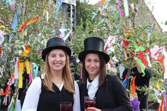 zwei Mädels vom Kerwekomitee mit bunt geschmückten Kerwebäumchen
