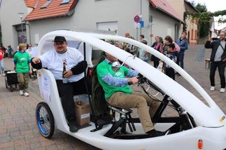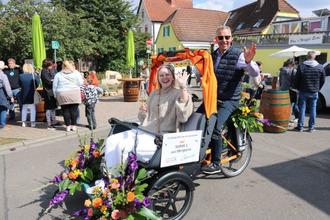 Weingräfin Sarah I. mit Bürgermeister K. Wagner auf der blumengeschmückten Fahrrad-Rikscha