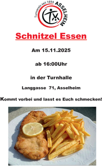 Der Turnverein Asselheim lädt am Samstag, den 15.11.2025 ab 16:00 Uhr zum Schnitzel-Essen in die Turnhalle, Langgasse 71, Grünstadt ein.