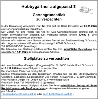 In der Gemarkung Asselheim, Flst. Nr. 366, hat die Stadt Grünstadt ab 01.01.2026 ein Gartengrundstück zu verpachten.