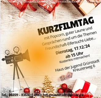 Am 17. Dezember ab 15 Uhr lädt das Haus der Jugend Grünstadt, Kreuzerweg 6, alle Kinder ab 6 Jahre zu einem abwechslungsreichen Kurzfilmtag ein! Auf dem Programm stehen mehrere Kurzfilme rund um die Themen Freundschaft – Eifersucht - Liebe…