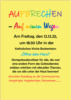 | 18:30 | Wort-Gottes-Feier auf neuen Wegen, „Öffne dein Herz!“, Bockenheim |