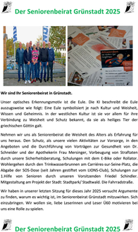 Nehmen wir uns als Seniorenbeirat die Weisheit des Alters als Erfahrung für uns heraus. Den Schutz, als unsere vielen Aktivitäten zur Vorsorge, in den Angeboten und die Durchführung von Vorträgen zur Gesundheit von Dr. Schneider und der Apothekerin Frau Mersinger, Vorbeugung von Straftaten durch unsere Sicherheitsberatung, Schulungen mit dem E-Bike oder Rollator. Wohlergehen durch den Trinkwasserbrunnen am Carriéres-sur-Seine-Platz, die Abgabe der SOS-Dose (seit Jahren gestiftet vom LIONS-Club), Schulungen zur 1.Hilfe von Senioren durch unseren Vorsitzenden Friedel Schindler. Mitgestaltung am Projekt der Stadt: Stadtpark/ Stadtwald. Die Fahrradstraße.