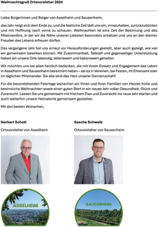 Für die bevorstehenden Feiertage wünschen wir Ihnen und Ihren Familien von Herzen frohe und besinnliche Weihnachten sowie einen guten Start in ein neues Jahr voller Gesundheit, Glück und Zuversicht. Lassen Sie uns gemeinsam mit frischem Elan und Zuversicht ins neue Jahr starten und auch weiterhin unsere Heimatorte gemeinsam gestalten.