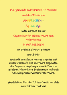 | 18.00 | Segensfeier für liebende Paare zum Valentinstag, Mertesheim |