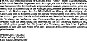 § 24 Abs. 6 der Gemeindeordnung für Rheinland-Pfalz - GemO - enthält folgende Regelung, auf die hiermit besonders hingewiesen wird: Satzungen, die unter Verletzung von Verfahrens- oder Formvorschriften der GemO oder aufgrund dieser zustande gekommen sind, gelten ein Jahr nach der Bekanntmachung als von Anfang an gültig zustande gekommen. Dies gilt nicht, wenn 1. die Bestimmungen über die Öffentlichkeit der Sitzung, die Genehmigung, die Ausfertigung oder die Bekanntmachung der Satzung verletzt worden sind oder 2. vor Ablauf der in Satz 1 genannten Frist die Aufsichtsbehörde den Beschluss beanstandet oder jemand die Verletzung der Verfahrens- oder Formvorschriften gegenüber der Stadtverwaltung Grünstadt unter der Bezeichnung des Sachverhaltes, der die Verletzung begründen soll, schriftlich geltend gemacht hat. Hat jemand eine Verletzung nach Satz 2 Nr. 2 geltend gemacht, so kann auch nach Ablauf 1 der in Satz 1 genannten Frist jedermann diese Verletzung geltend machen.