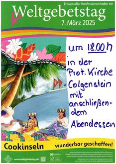 Am 07. März 2025 findet der Weltgebetstag der Frauen um 18.00 Uhr in der Prot. Kirche Colgenstein statt. Thema sind die Cookinseln – wunderbar geschaffen!