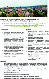 | • Leitung des technischen Bereichs der Bauabteilung mit Personalverantwortung für 6 Mitarbeiter*innen • Koordination und Projektleitung bei Neubau-, Sanierungs- und Modernisierungsmaßnahmen städtischer Gebäude (wie z.B. Rathaus, Schulen, Kindergärten) in Zusammenarbeit mit externen Ingenieurbüros • Ausübung der Bauherrenfunktion bei städtischen Hochbaumaßnahmen unter besonderer Berücksichtigung der Kosten-, Termin- und Qualitätskontrolle • Erstellung und Prüfung von vergabe- und vertragsrelevanten Unterlagen • Formulierung von Entscheidungsvorschlägen für die politischen Gremien und Präsentation in Sitzungen | Ihr Profil • Hochschulstudium, Bachelor-, Master-, Diplomabschluss oder einen gleichwertigen Abschluss im Bauingenieurwesen oder Architektur • Berufserfahrung in kommunaler Bauverwaltung wünschenswert • Kenntnisse in Vertragswesen, Planung, Bauleitung, Ausschreibung, Vergabe, Abrechnung, Projektmanagement und fundierte Kenntnisse im Bereich HOAI, VOB, LBauO • selbständiges, koordiniertes und ziel-orientiertes Arbeiten, ausgeprägte Eigeninitiative, Teamfähigkeit • freundliches und sicheres Auftreten gegenüber Dritten, Verhandlungsgeschick • PC- + Softwarekenntnisse (insbesondere MS-Office + AutoCAD • Erfahrung in der Leitungsfunktion wünschenswert |