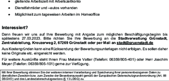 Dann freuen wir uns auf Ihre Bewerbung mit Angabe zum möglichen Beschäftigungsbeginn bis spätestens 27.03.2023. Bitte richten Sie Ihre Bewerbung an die Stadtverwaltung Grünstadt, Zentralabteilung, Kreuzerweg 2, 67269 Grünstadt oder per Mail an stadt@gruenstadt.de