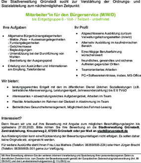 Die Stadtverwaltung Grünstadt sucht zur Verstärkung der Ordnungs- und Sozialabteilung zum nächstmöglichen Zeitpunkt: