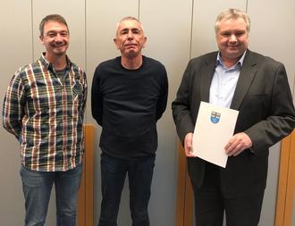 Für 40 Jahre im öffentlichen Dienst erhielt Matthias Genari (Bild Mitte) im Rahmen einer kleinen Feierstunde nicht nur die offizielle Urkunde von Bürgermeister Andreas Poignée (rechts). Der Bürgermeister sprach ihm vor allem den Dank und die Anerkennung der Gemeinde Limburgerhof für die geleisteten treuen Dienste aus.