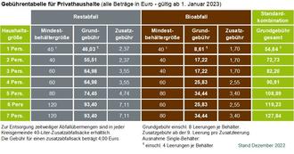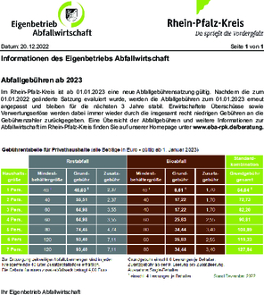Im Rhein-Pfalz-Kreis ist seit 01.01.2023 eine neue Abfallgebührensatzung gültig. Nachdem die zum 01.01.2022 geänderte Satzung evaluiert wurde, werden die Abfallgebühren zum 01.01.2023 erneut angepasst und bleiben für die nächsten drei Jahre stabil. Erwirtschaftete Überschüsse sowie Verwertungserlöse werden dabei immer wieder durch die insgesamt recht niedrigen Gebühren an die Gebührenzahler zurückgegeben. Eine Übersicht der Abfallgebühren und weitere Informationen zur Abfallwirtschaft im Rhein-Pfalz-Kreis finden sich auf www.eba-rpk.de/beratung.
