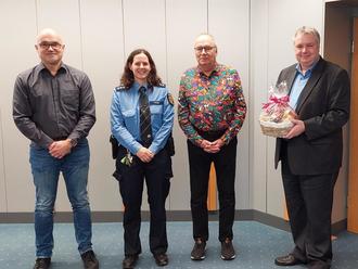 Beim gleichen Anlass wurde der langjährige Kontaktbeamte Limburgerhofs Bernd Krächan (Zweiter von rechts) in den Ruhestand verabschiedet. Bürgermeister Poignée bedankte sich für die langjährige gute Zusammenarbeit und das Engagement für die Gemeinde Limburgerhof (weiterer Bericht folgt).
