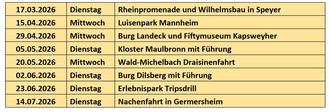 Nachfolgend ist das Programm der geplanten Fahrten für das erste Halbjahr 2026 zusammengestellt – ein abwechslungsreicher Start ins neue Ausflugsjahr!