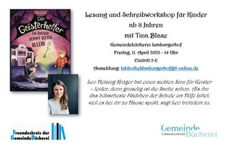 Freitag, 11. April - 14 Uhr: Lesung und Schreibworkshop für Kinder ab 8 Jahren mit Tina Blase - „Die Geisterhelfer - Ein Knochen kommt selten allein“. Eintritt: 5 € Bitte anmelden unter: bibliotheklimburgerhof@t-online.de