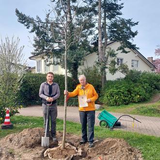 Eine Elsbeere spendete Herr Trost (rechts) für die öffentlichen Grünflächen. Der Baum wurde am Fußweg hinter der Domholzschule Richtung Mühlweg von ihm und Limburgerhofs Gärtnermeister Sven Schäfer gepflanzt.