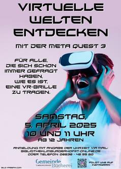 Samstag, 5. April – Virtuelle Welten entdecken, mit der Meta Quest 3. Neugierig? Für alle, die sich schon immer gefragt haben, wie es ist, mit einer VR-Brille umzugehen. Ab 12 Jahren. 1. Termin 10 bis 11 Uhr, 2. Termin 11 bis 12 Uhr - Anmeldung via Mail bibliotheklimburgerhof@t-online.de oder Telefon 06236 - 46 55 20. Ab dem 10. Juni können pro Öffnungstag 2 Termine (max. 1 Stunde) ausgemacht werden. Melden Sie sich dazu bitte telefonisch oder per Mail. Neben einfachen Mini-Spielen, können auch fremde Welten virtuell entdeckt werden. Besonders Mutige dürfen sich Batmans Cape umwerfen (ab 18 Jahren).
