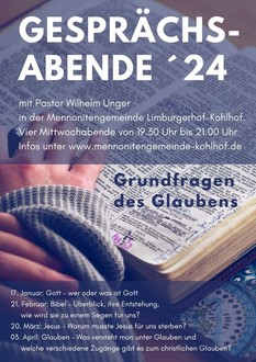 Bibelgesprächsabend mit Pastor Wilhelm Unger über Grundfragen des Glaubens in der Mennonitengemeinde Limburgerhof-Kohlhof. Vier Mittwochabende von 19.30 Uhr bis 21.00 Uhr. Infos unter www.mennonitengemeinde-kohihof.de