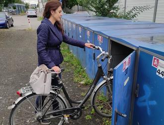 Die Velo-Container – aufgestellt von der Firma Stöhr – sind aus Metall, einbruchssicher und wasserdicht. Das Rad steht in einer fest installierten Schiene. Außerdem gibt es noch Ablagemöglichkeiten, zum Beispiel für Radbekleidung oder Helm.