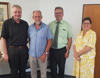 Mit der Ehrennadel des Landes Rheinland-Pfalz wurde Eberhard Bucher (Zweiter von links) aus Limburgerhof ausgezeichnet. Die Urkunde übergab Landrat Clemens Körner (Zweiter von rechts). Zu den ersten Gratulanten gehörten Erste Beigeordnete Rosemarie Patzelt und Bürgermeister Andreas Poignée.