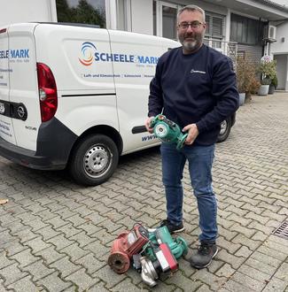 Markus Krause – Techniker der Firma Scheele & Mark Service, mit bereits ausgetauschten Heizungspumpen in Limburgerhof.