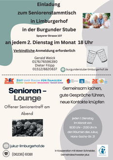 Gemütlich am Abend zusammensitzen und gemeinsam etwas essen oder einfach nur neue Menschen kennenlernen – dies ist seit einiger Zeit für Senioren in Limburgerhof möglich: Gemeinsam gegen Einsamkeit. Initiiert durch Gemeindeschwester plus Maren Schneider findet jeden 1. Dienstag im Monat eine Seniorenlounge im JUKUZ Limburgerhof, Hans-Sachs-Str. 21, von 18:30 – 21:30 Uhr statt. Eine Anmeldung ist nicht erforderlich. Nähere Informationen unter 06236/61381.