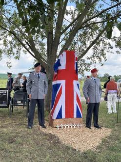 Sogar ein Zeitzeuge aus Limburgerhof war zur Gedenkstunde gekommen: der 99-jährige Werner Raubenheimer, im Jahr 1945 Flakhelfer in Ludwigshafen. Zusammen mit Erik Wieman ließ er weiße Tauben in den Himmel fliegen. Als Friedenssymbole, aber auch, weil Militärmaschinen Brieftauben an Bord hatten, die - wenn es zu einem Absturz kam - versehen mit einer Notiz der Absturzstelle, zur Basis zurückfliegen konnten. Zur Erinnerung an die Rettung eines Teils der Besatzung landeten während der Gedenkfeier vier Fallschirmspringer (Aeroclub Walldorf e.V.) genau an der Absturzstelle. Sie führten Erinnerungsplaketten mit sich, die sie den Angehörigen übergaben. Fundstücke des Wracks waren am Ort ausgestellt, so zum Beispiel ein Teil des Steuers, das Pilot Wakeham in den Händen hielt. Mit historischen Militärfahrzeugen konnten einige Gäste den kurzen Weg von der Absturzstelle zum Gedenkstein fahren. Als besondere Ehre für die Besatzung drehte eine historische Jagdfliegermaschine eine Pirouette am Himmel, sozusagen ein letzter Fliegergruß. Musikalisch umrahmt wurde die Veranstaltung von Markus Mohr (Kornett), er spielte „Last Post“, Major Mackenzie und Thomas Chelius (Dudelsack).