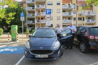 Zusammen mit Limburgerhofs Bürgermeister Andreas Poignée (rechts) übergab Dieter Netter von stadtmobil Rhein-Neckar am 24. August den Kunden ein zweites CarSharing-Auto. Der Kleinwagen steht an der neuen Station „Mühlweg 49“.