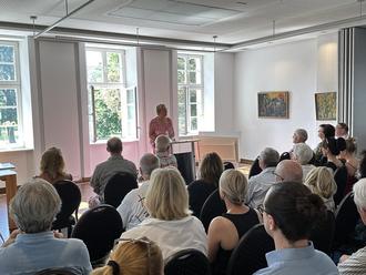 In Limburgerhof öffnete das Schlösschen im Park seine Pforten für die Besucherinnen und Besucher von zwei Veranstaltungen. Um 11 Uhr nahmen zahlreiche Gäste an der Eröffnung einer Vernissage des bekannten Neuhofener Ehrenbürgers und Künstlers Otto Ditscher (1903-1987) teil. Die Kunsthistorikerin Ursula Dann aus Mannheim (im Bild) schilderte Werdegang und künstlerische Leistung des großen Pfälzer Malers. Anschließend bestand für die Gäste die Möglichkeit, die Werke und weiteres Informationsmaterial zu erkunden und bei einem Sektempfang sich über Kunst und Kultur auszutauschen.