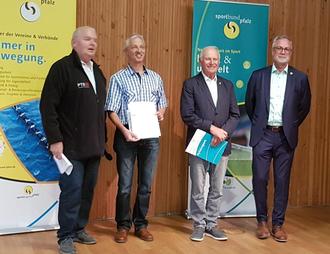 Auf Einladung des Sportbundes Pfalz nahm der Sportabzeichenverantwortliche der TG 04 Limburgerhof, Uwe Weber (Zweiter von links), am Ehrungsabend im Haus der Nachhaltigkeit mitten im Pfälzer Wald teil. Die Sportabzeichengruppe der TG 04 belegte im Vereinswettbewerb des Deutschen Sportabzeichens für das Jahr 2022 einen hervorragenden dritten Platz im Bereich des Sportbundes Pfalz. Die Platzierung ergibt sich aus der Relation der abgelegten Sportabzeichen zur Mitgliederzahl des jeweiligen Vereins. Als Anerkennung für die tolle Leistung erhielt die TG 04 Limburgerhof eine Urkunde, verbunden mit einer Geldspende vom Sportbund Pfalz.