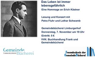 Donnerstag, 7. November – 19 Uhr: „Das Leben ist immer lebensgefährlich“ - Eine Hommage an Erich Kästner. Eintritt: 5 € VVK: Buchhandlung Frank und Gemeindebücherei