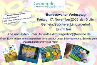 Freitag, 17. November ab 14 Uhr – Vorlesetag in der Gemeindebücherei – mit Bilderbuchkino und vielen weiteren tollen Aktionen für die ganze Familie. Bitte anmelden unter bibliotheklimburgerhof@t-online.de