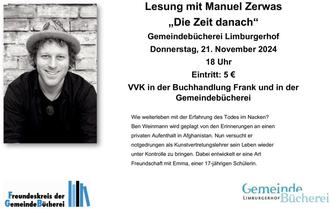 Donnerstag, 21. November - 18 Uhr: „Die Zeit danach“ Lesung mit Manuel Zerwas. Eintritt: 5 € VVK: Buchhandlung Frank und Gemeindebücherei