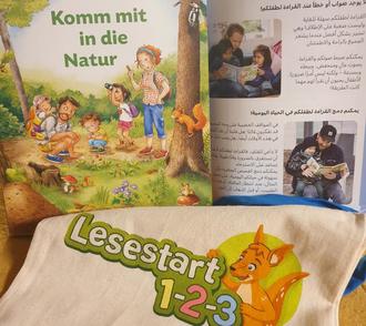 Ab sofort können bei uns die neuen, prall gefüllten Lesetaschen der Stiftung Lesen, „Lesestart 1-2-3“, kostenfrei mitgenommen werden. Die schön aufgemachten Pappbilderbücher drehen sich um das Thema Natur. Antworten auf weitere Fragestellungen rund ums Vorlesen finden sich gut erklärt in einem mehrsprachigen Beiheft. Dieses unterstützt die Eltern bez. Vorlesenden während der Vorlesezeit. Die Informationen sind in arabischer, deutscher, englischer, türkischer und rumänischer Sprache. Es ist besonders für Familien gedacht, die sich Anregungen und mehr Wissen rund um das Vorlesen wünschen. Es ist sehr gut für die Sprachentwicklung geeignet. Jedes Buch wird in einer kleinen Stofftasche überreicht, um das Lieblingsbuch mit weiteren kleinen Spielsachen immer mit sich tragen zu können.