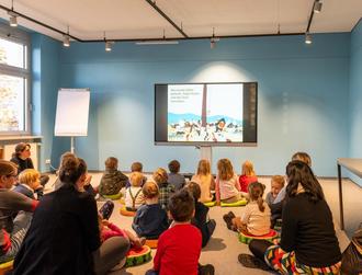 Zusätzlich zu diesen Aktionen wurden auf dem Smartboard Bilderbuchkinos angeboten. Die Kinder konnten sich gemütlich auf Kissen niederlassen und den Geschichten lauschen, während die Bilder auf einer großen Leinwand gezeigt wurden.