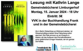 Montag, 15. Januar – 18 Uhr: Lesung mit Kathrin Lange: „Toxin“ Eintritt: 5€ Vorverkauf in der Buchhandlung Frank oder in der Gemeindebücherei