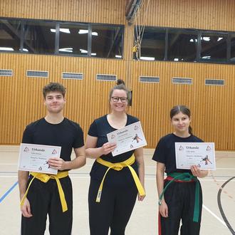 Bei den Kindern stellten sich Sophie, L., Johannes, Antonio und Martha der Gelbgurt-, L., Benaja, Melia und Leandro der Gelb-Orangegurt- und Paul, Maximilian, sowie Sophia der Orangegurtprüfung (Bild 2). Bei den Erwachsenen traten Lara und Fynn zur Gelbgurt-, sowie Lidia zur Grüngurtprüfung an (Bild 1).