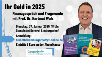 | 18 Uhr: | Ihre Finanzen in 2025 – Finanzgespräch mit Prof. Dr. Hartmut Walz. Eintritt: 5 € an der Abendkasse Um Anmeldung wird gebeten unter: bibliotheklimburgerhof@t-online.de |