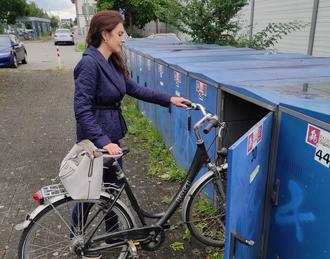 Die Velo-Container - aufgestellt von der Firma Stöhr - sind aus Metall, einbruchssicher und wasserdicht. Das Rad steht in einer fest installierten Schiene. Außerdem gibt es noch Ablagemöglichkeiten, zum Beispiel für Radbekleidung oder Helm.