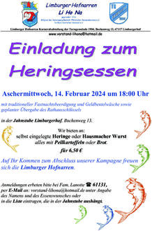 ABER: „Bald ist wieder Aschermittwoch“ – am 14. Februar 2024 um 18 Uhr laden die Limburger Hofnarren zum traditionellen Heringsessen in die Jahnstube ein. Um Voranmeldungen mit Angabe des Essenswunsches – Hering oder Hausmacher Wurst – wird gebeten bei Familie Lanotte, ( 61131, per E-Mail "vostand-lihona@hotmail.de oder per Eintrag in die Liste in der Jahnstube.