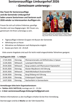 Auch 2026 organisiert das „Team für Seniorenausflüge“ mit viel Engagement erlebnisreiche Ausflüge für die Seniorinnen und Senioren unserer Gemeinde. Ein Blick auf das vergangene Jahr zeigt, wie gut das Angebot angenommen wird.