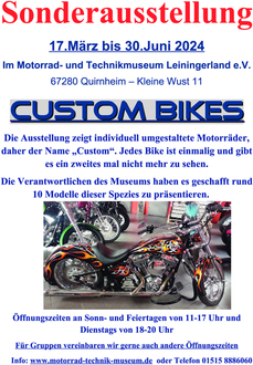 Die Verantwortlichen des Museums haben sich entschlossen, eine etwas andere Sonderausstellung zu veranstalten, die sich mit dem Thema "Custombike" beschäftigt. Das erste Custombike tauchte 1969 in dem Film "Easy Rider" auf. Der Custombike-Bau begann jedoch schon 1948 in Kalifornien. Custombike, engl. custom: maßgeschneidert, ist der Oberbegriff für ein speziell auf die Wünsche des Besitzers angefertigtes oder umgebautes Motorrad. Dabei sind dem Einfallsreichtum und der Kreativität keine Grenzen gesetzt. Es können die skurrilsten und absurdesten Exemplare entstehen, aber auch Bikes, die sich durch schlichte Eleganz auszeichnen. Jedes Bike ist ein Unikat und wie der Name schon sagt kein zweites mal existent.