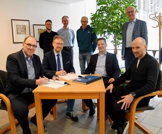Formaler Akt: (Vorn sitzend von links) Stefan Krieger von Hydro-Ingenieure, Bürgermeister Michael Reith von der VG Lambsheim-Heßheim, Bürgermeister Frank Rüttger von der Verbandsgemeinde Leiningerland und Dr. Thomas Siekmann von der gleichnamigen Ingenieurgesellschaft unterzeichnen die Verträge im Beisein von (hinten stehen von links) Werkleiter Marco Kling von der VG Lambsheim-Heßheim, Normann Geisler, stellvertretender Werkleiter der Verbandsgemeinde Leiningerland, Betriebsleiter Gerd Asel und Werkleiter Ralf Keller von der VG Leiningerland.