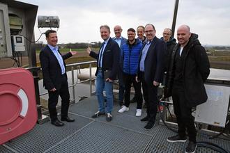 Mit Blick auf die Fläche; auf der die Erweiterung der Gruppenkläranlage in Heßheim erfolgen soll: (von links) Bürgermeister Frank Rüttger von der VG Leiningerland, Bürgermeister Michael Reith von der VG Lambsheim-Heßheim, Werkleiter Ralf Keller von der VG Leiningerland, Werkleiter Marco Kling von der VG Lambsheim-Heßheim, Normann Geisler, stellvertretender Werkleiter der VG Leiningerland, Stefan Krieger von Hydro-Ingenieure, Betriebsleiter Gerd Asel und Dr. Thomas Siekmann von der gleichnamigen Ingenieurgesellschaft.