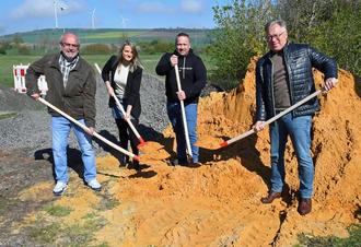 Offizieller Spatenstich für den Weg zum schnellen Internet: von links: Ebertsheimer Beigeordneter Elpidio Battistutta, Alexandra Schmitt Laubscher und Andreas Laubscher von Mawa sowie Ortsbürgermeister Bernd Findt.