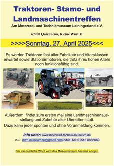 Wir erwarten unter anderem die Oldtimerfreunde Ottersheim, den Pfälzer Bulldog-Club aus Münchweiler sowie die Oldtimerfreunde Clauserhof und die Traktorfreunde Eisbachtal die so manche Rarität mit zum Museum bringen.