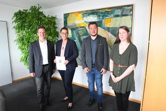 v. l. n. r.: Bürgermeister Frank Rüttger, Staatssekretärin Petra Dick-Walther, Bauamtsleiter Dennis Zimmermann und Jorinde Schobert, die für Klimaschutz zuständige Mitarbeiterin der VG